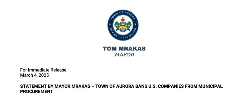 STATEMENT – Town of Aurora bans U.S. companies from municipal procurement.